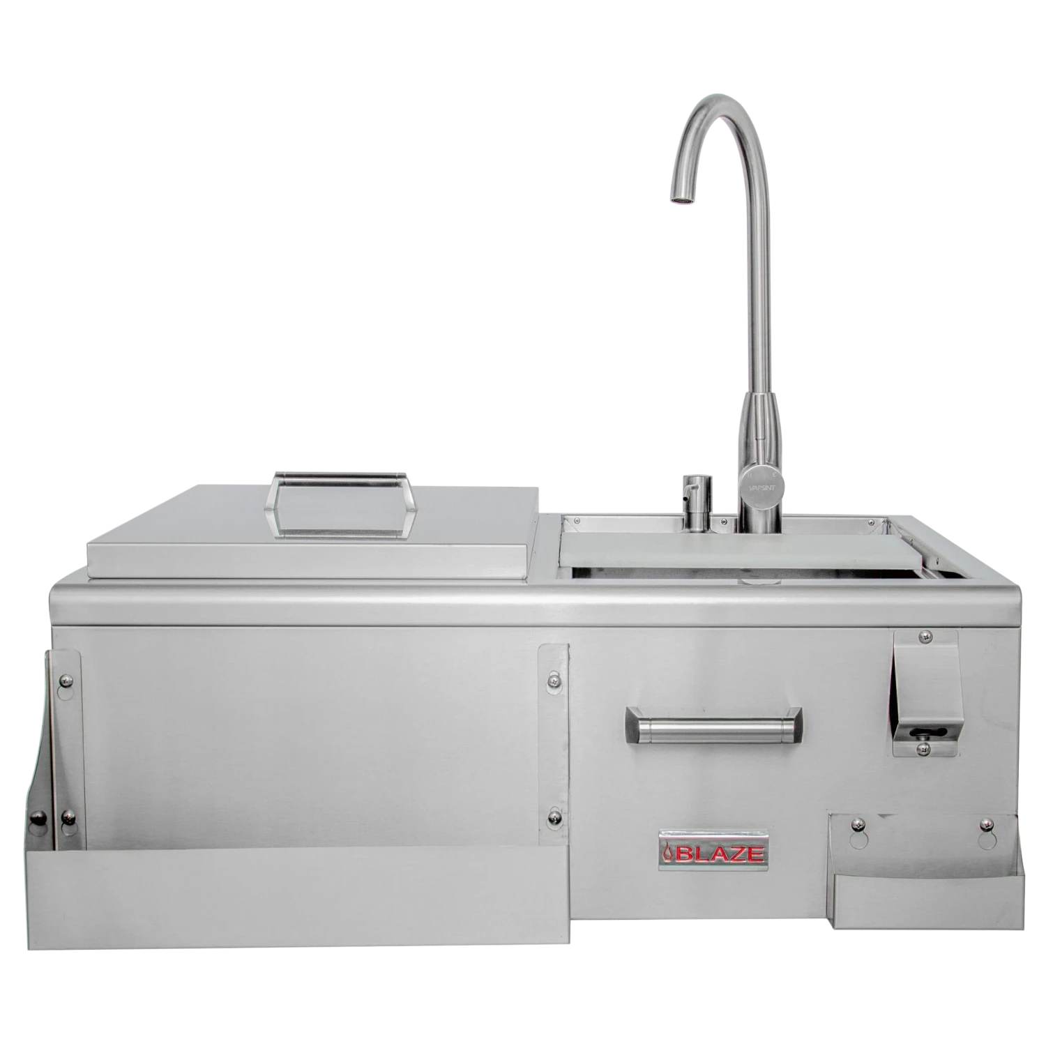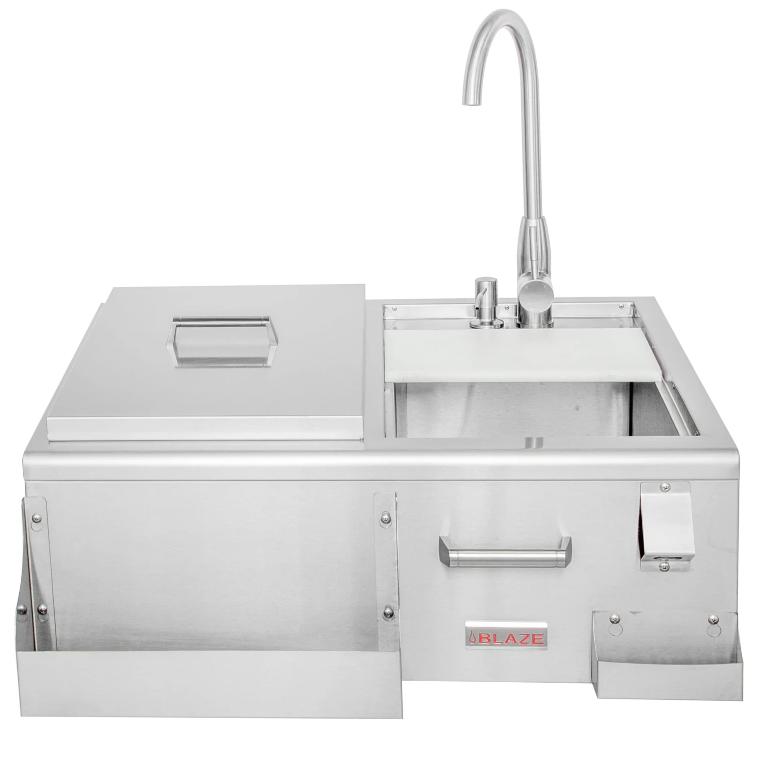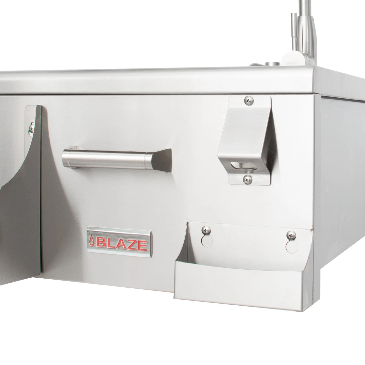 This Blaze beverage center features a hot and cold water faucet and an insulated ice bin. The sink has a built-in soap dispenser, sliding removable cutting board, and towel rack. The front bottle storage makes for easy entertaining, and the drainage holes make it easy to clean. Next to the bottle storage is a convenient bottle opener with a bottle cap catch. The ice bin is insulated, has a built-in drain hole for quick clean-up, and includes an insulated stainless steel cover to keep it clean. A removable condiment tray with three compartments fits over the ice tray.