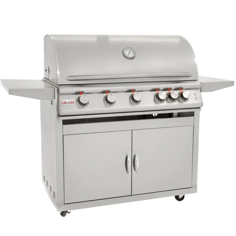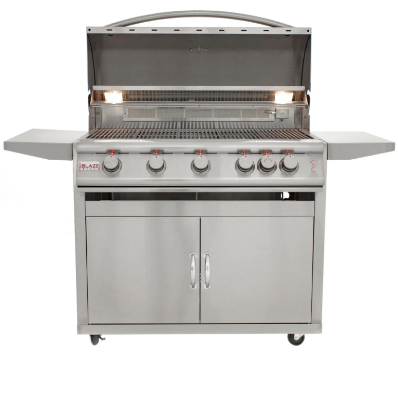 Blaze is proud to introduce an affordable, premium-grade grill that was designed with your outdoor BBQ challenges in mind. The Premium LTE series takes grilling to the next level with a signature LED Illuminated Control System and integrated halogen hood lighting, perfect for nighttime grilling and entertaining. The 40-inch Premium LTE cooking system comes with five 304 cast stainless steel burners that deliver an impressive 14,000 BTUs of cooking power, for a total of 70,000 BTUs on the cooking surface. The 10,000 BTU infrared rear burner works great with the optional rotisserie kit for grilling versatility. Durable patented, triangle-shaped 9mm stainless steel searing rods on the spacious 915 square inches of cooking space allow for searing the heartiest steaks while preventing your veggies from rolling away. The stainless steel Heat Zone Dividers empower you to use different cooking zones across the grilling surface. Creating separate zones that can be used for different styles of cooking is what premium grilling is all about, after all. The Blaze Push & Turn Flame-Thrower with Backup Flashtube & Crossover Channels ignition system provides a steady and reliable flame with every start. The removable warming rack, meanwhile, is an ideal place to keep bread and other food heated while you grill the other courses. The Flame Stabilizing System includes a 14-gauge flame stabilizer grid that minimizes flare-ups while you enjoy your Blaze grill. The Grease Control system with removable lower heat baffles and a full-width drip tray make cleanup a breeze. The 304 stainless steel grill hood is double-lined to protect the outer layer from heat discoloration, keeping your Blaze grill looking shiny and new well past first, 10th, or 50th use! Please note that a 110V power source is required. This product is ETL-certified with an ANSI Z21.58-2018/CSA 1.6 rating.