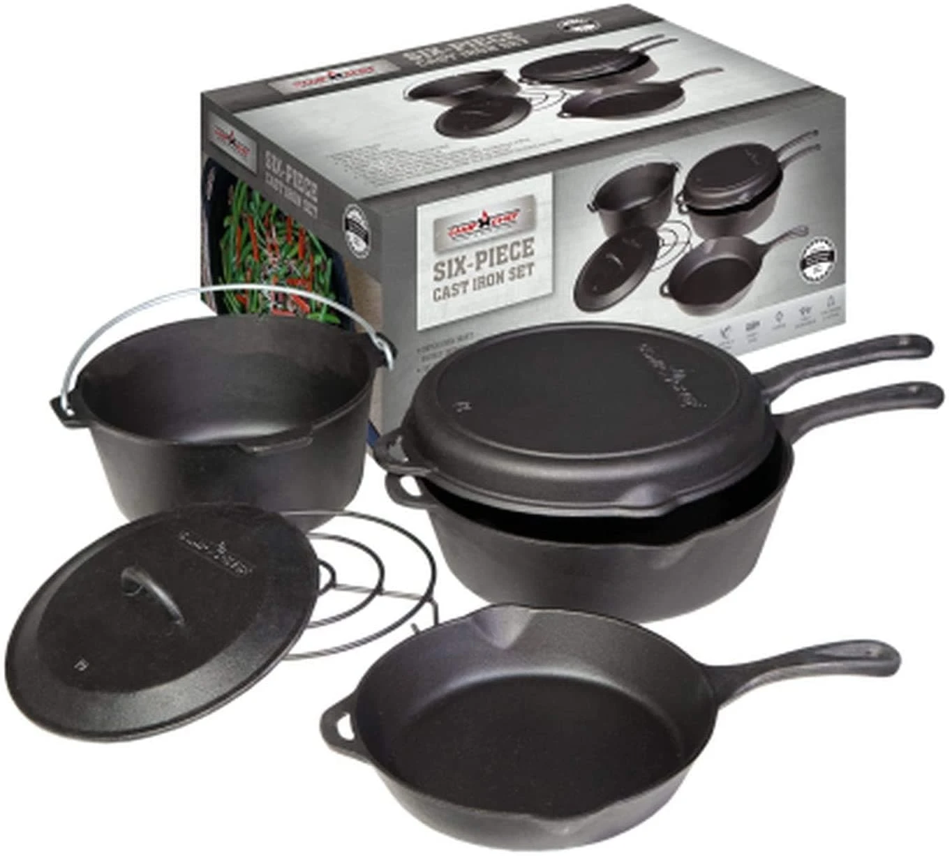 There’s no better way to start off your cast iron collection than with our 6-Piece Cast Iron Set. The kit includes a legless Dutch oven with a trivet, a 10-inch skillet, and a deep skillet with a matching lid that doubles as another skillet; you’ll have all the cast iron cookware you need for your favorite meals in the kitchen, at the campsite, or on the back patio. With our True Seasoned Finish, you can get cooking with your cast iron right away. Enjoy superior cast iron cooking today with the 6-Piece Cast Iron Set.