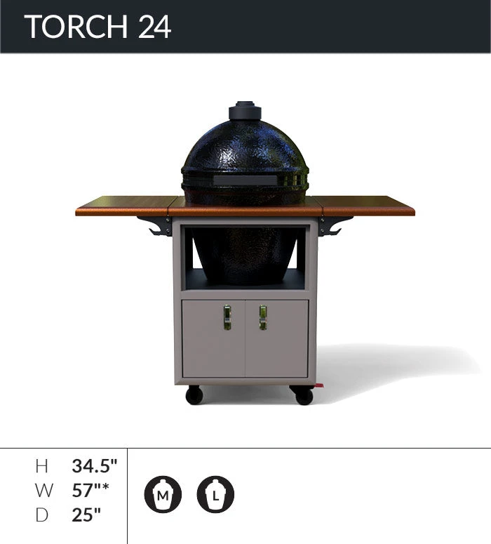 A weatherproof, low-maintenance cabinet to support your ceramic grill. It features dry-sealed storage to protect all your grilling and outdoor kitchen equipment. Offering sizes to fit various ceramic grill manufacturers. With its durable casters, the Torch makes it easy to move your ceramic grill.