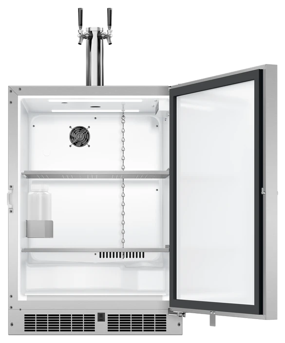 With dynamic cooling technology and frost-free operation, you can ensure beer is kept cool at your preferred serving temperature. The double insulated stainless steel tower reduces foam, for a consistently perfect pour. Dual taps allow you to dispense two different beer kegs at the same time, for flexibility and choice. An integrated drain system keeps spillage under control, and removable components make for easier cleaning. Designed for outdoor use and built to last, an anti-scuff interior floor shield and stainless steel threshold protect against cabinet wear and tear from loading and unloading kegs. Receive audible alerts when the door is left ajar, and at high or low temperatures, to ensure your contents remain at an optimal temperature. Your beer dispenser has a door lock for added safety and security – a must-have for storage outside.