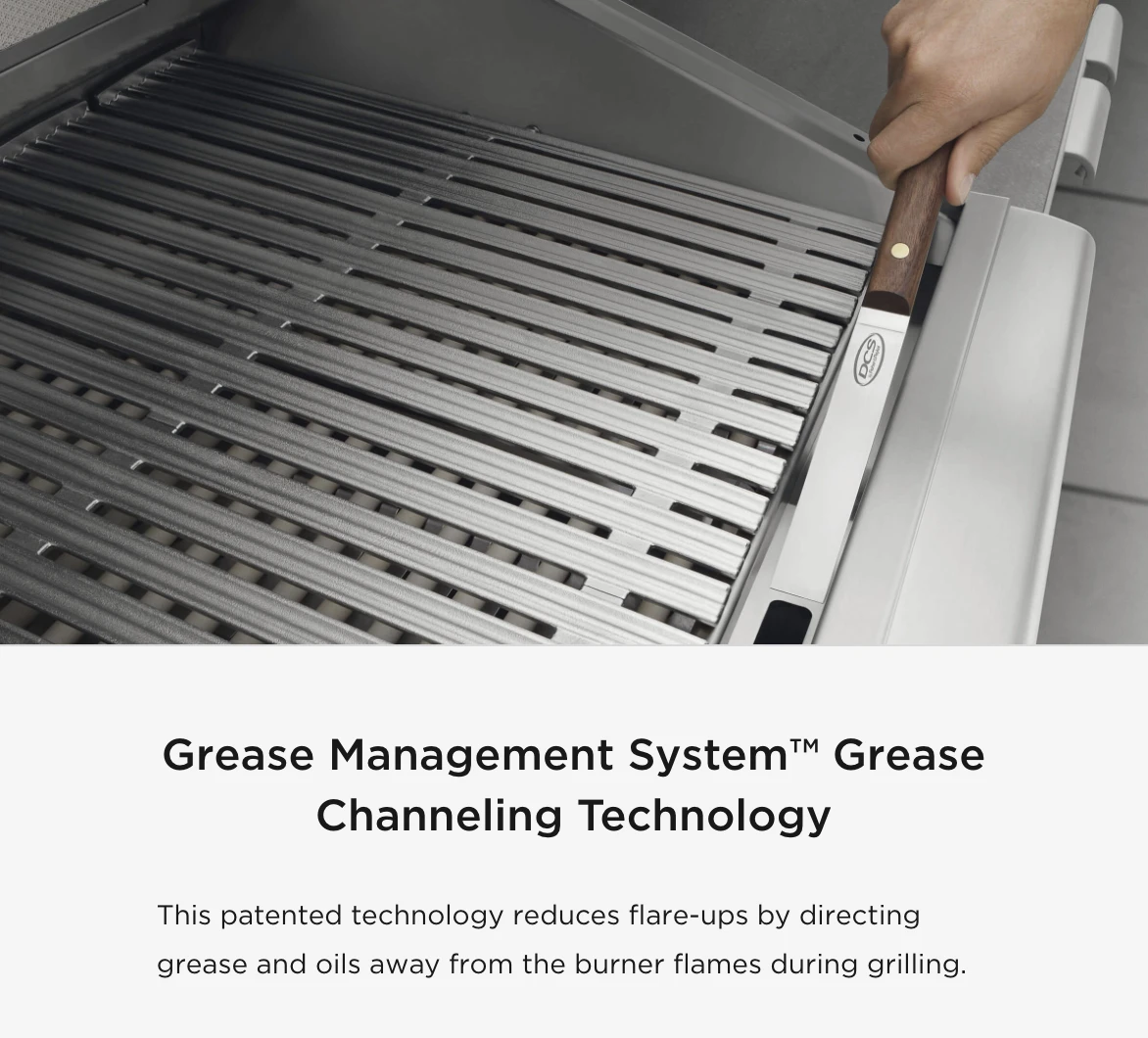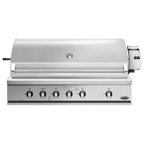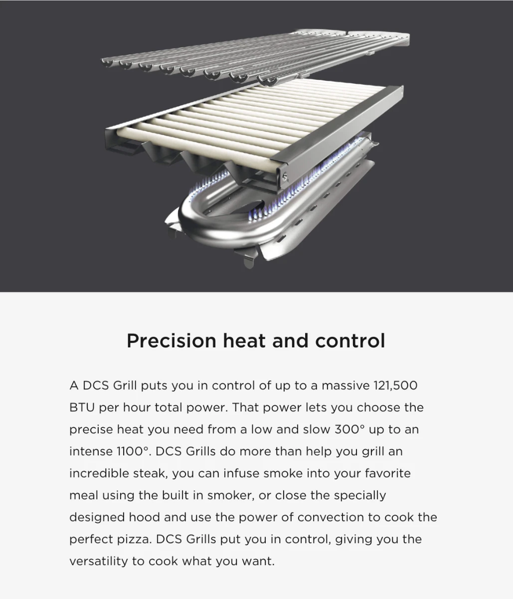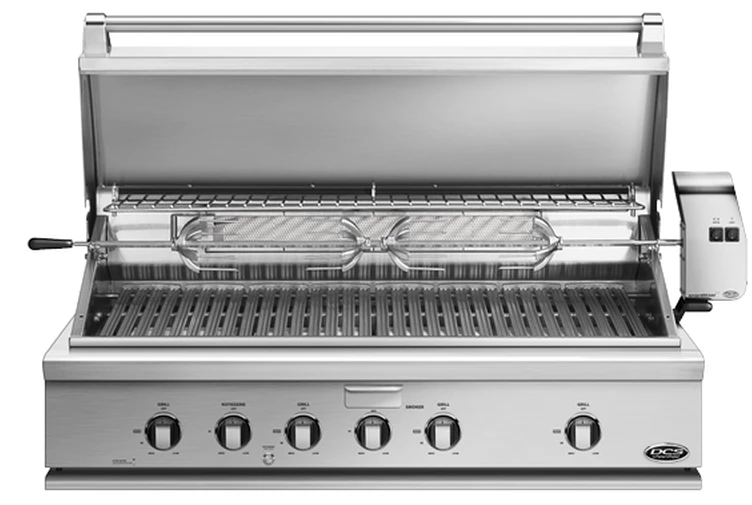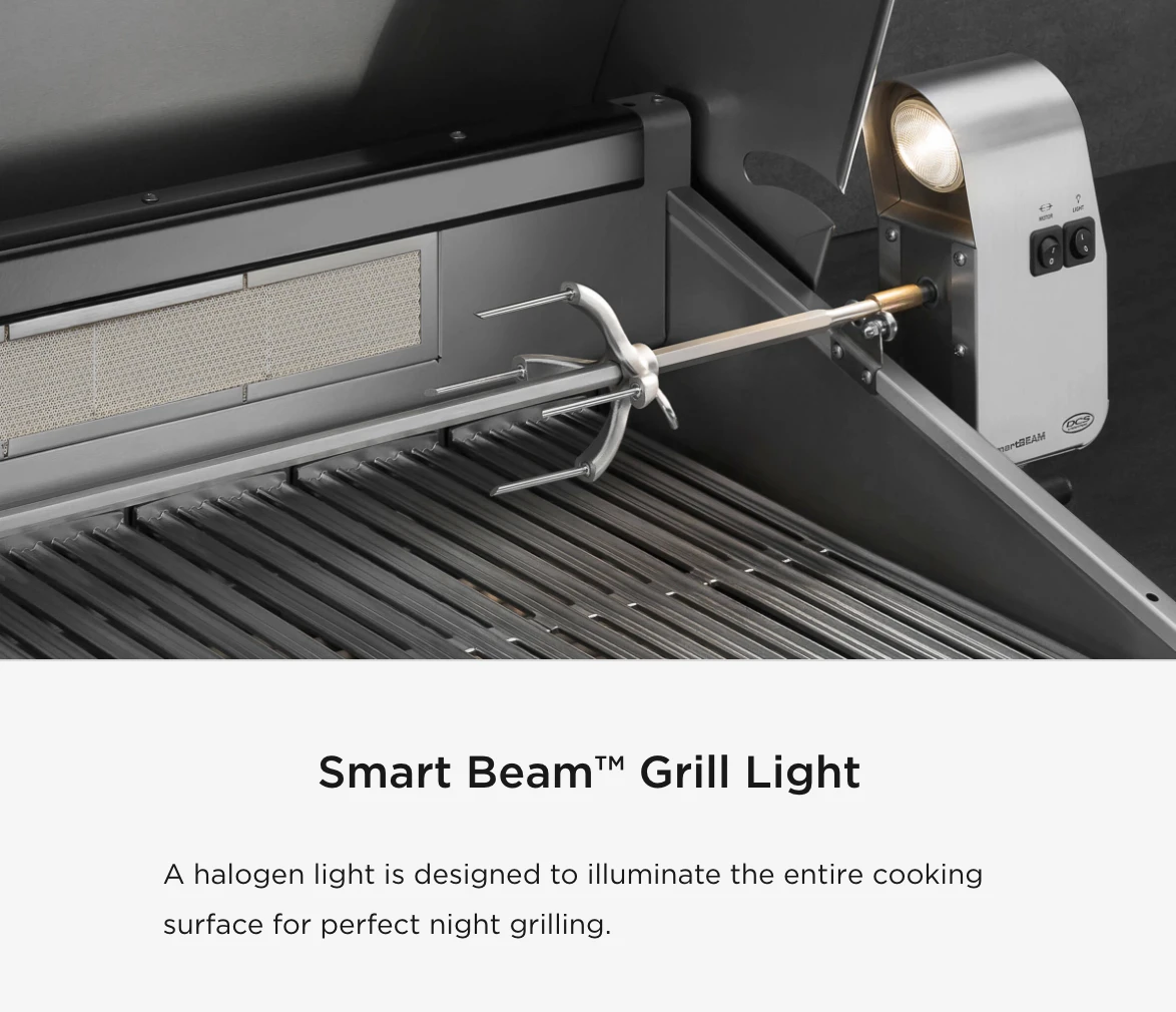 FOR MORE DETAILS. DCS grills are engineered for people who want to cook just like a professional chef in their own home. This 48-inch natural gas built-in grill features four 25,000 BTU U-shaped stainless steel burners that push an impressive total of 100,000 BTUs of cooking power. Each burner features a heat shield that directs heat upwards, maximizing grilling efficiency. DCS grills offer Ceramic Radiant Technology, which is a layer of ceramic rods placed between the burners and cooking grate. The rods provide intensely, yet even heat, ensuring the temperature is consistent across the entire grilling surface. This innovative feature allows you to sear meat to perfection anywhere on the cooking grid. This grill boasts an 855 square inch main cooking surface with durable, double-sided cast stainless steel cooking grids. One side has a gentle curve that supports and handles fish and vegetables. The other side of the grates accommodates steaks and other cuts of meat, capturing grease while creating perfect sear lines. DCS BH1 grills feature a wider range of cooking temperatures with valves that can be turned down to as low as 300 degrees at the grilling surface. The patented Grease Management system effectively channels grease and oil away from the flame while grilling, which greatly reduces flare-ups. The 18,000 BTU infrared rear burner functions perfectly for slow-roasting, and the included rotisserie kit can accommodate up to 50 lbs! The smoker tray is welded closed so you can add your favorite wine or beer into the tray. A dedicated 3,500 BTU smoker burner allows the wood chips to slowly smolder for more layers of flavor. The removable warming rack features a spacious 327 square inch, stainless steel warming area. The push and turn 9-volt battery ignition operates with the ease of an indoor range, and the 40-watt halogen Smart Beam BBQ grill light adds visibility while you grill. The temperature gauge allows you to control cooking temperatures. Every DCS grill is handcrafted and constructed entirely of heavy gauge, type 304 stainless steel. Model Number: BH1-48RI-N/L Width Depth Height Weight Cutout Width Cutout Depth Cutout Height