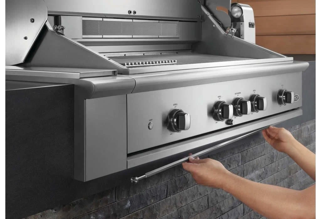FOR MORE DETAILS. DCS grills are engineered for people who want to cook just like a professional chef in their own home. This 36-inch natural gas built-in grill features three 25,000 BTU U-shaped stainless steel burners that push an impressive total of 75,000 BTUs of cooking power. Each burner features a heat shield that directs heat upwards, maximizing grilling efficiency. DCS grills offer Ceramic Radiant Technology, which is a layer of ceramic rods placed between the burners and cooking grate. The rods provide intensely, yet even heat, ensuring the temperature is consistent across the entire grilling surface. This innovative feature allows you to sear meat to perfection anywhere on the cooking grid. This grill boasts a 630 square inch main cooking surface with durable, double-sided cast stainless steel cooking grids. One side has a gentle curve that supports and handles fish and vegetables. The other side of the grates accommodates steaks and other cuts of meat, capturing grease while creating perfect sear lines. Large food items can comfortably fit on the grill, thanks to a hood designed with extra space and a full 90 degrees of movement. DCS Series 9 grills feature a wider range of cooking temperatures with valves that can be turned down to as low as 300 degrees at the grilling surface. The patented Grease Management system effectively channels grease and oil away from the flame while grilling, which greatly reduces flare-ups. The 14,000 BTU infrared rear burner functions perfectly for slow-roasting, and the included rotisserie kit can accommodate up to 50 lbs! The rotisserie is not in use, the spit rod can conveniently be stored under the drip panhandle. The charcoal smoker tray includes its own cooking grate and can easily be placed over one of the burners. Simply remove one of the cast stainless steel cooking grids and ceramic rod trays, then place the charcoal smoker box over the burner. Either grill directly over it, or fill it with wood chunks to add more smoke to everything on your grill. This grill has a multi-level warming area with 2 warming racks and a broiling pan that can be rearranged to suit your needs. This gives you 534 square inches of additional versatile cooking area. The push and turn hot surface ignition operates with the ease of an indoor range, while intuitive lighting from a 40-watt halogen Smart Beam BBQ grill light, as well as the two hood lights, add visibility while you grill. LED lights in the knob bezels glow white when the grill is on, and orange when that specific burner is in use. The temperature gauge allows you to control cooking temperatures. Every DCS grill is handcrafted and constructed entirely of heavy gauge, type 304 stainless steel. Model Number: BE1-36RC-N/L  Width Depth Height Weight Cutout Width Cutout Depth Cutout Height