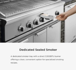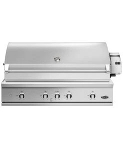 DCS grills are engineered for people who want to cook just like a professional chef in their own home. This 48-inch propane gas built-in grill features four 25,000 BTU U-shaped stainless steel burners that push an impressive total of 100,000 BTUs of cooking power. Each burner features a heat shield that directs heat upwards, maximizing grilling efficiency. DCS grills offer Ceramic Radiant Technology, which is a layer of ceramic rods placed between the burners and cooking grate. The rods provide intensely, yet even heat, ensuring the temperature is consistent across the entire grilling surface. This innovative feature allows you to sear meat to perfection anywhere on the cooking grid. This grill boasts an 855 square inch main cooking surface with durable, double-sided cast stainless steel cooking grids. One side has a gentle curve that supports and handles fish and vegetables. The other side of the grates accommodates steaks and other cuts of meat, capturing grease while creating perfect sear lines. Large food items can comfortably fit on the grill, thanks to a hood designed with extra space and a full 90 degrees of movement. DCS Series 9 grills feature a wider range of cooking temperatures with valves that can be turned down to as low as 300 degrees at the grilling surface. The patented Grease Management system effectively channels grease and oil away from the flame while grilling, which greatly reduces flare-ups. The 18,000 BTU infrared rear burner functions perfectly for slow-roasting, and the included rotisserie kit can accommodate up to 50 lbs! The rotisserie is not in use, the spit rod can conveniently be stored under the drip panhandle. The charcoal smoker tray includes its own cooking grate and can easily be placed over one of the burners. Simply remove one of the cast stainless steel cooking grids and ceramic rod trays, then place the charcoal smoker box over the burner. Either grill directly over it, or fill it with wood chunks to add more smoke to everything on your grill. This grill has a multi-level warming area with 2 warming racks and a broiling pan that can be rearranged to suit your needs. This gives you 738 square inches of additional versatile cooking area. The push and turn hot surface ignition operates with the ease of an indoor range, while intuitive lighting from a 40-watt halogen Smart Beam BBQ grill light, as well as the two hood lights, add visibility while you grill. LED lights in the knob bezels glow white when the grill is on, and orange when that specific burner is in use. The temperature gauge allows you to control cooking temperatures. Every DCS grill is handcrafted and constructed entirely of heavy gauge, type 304 stainless steel.
