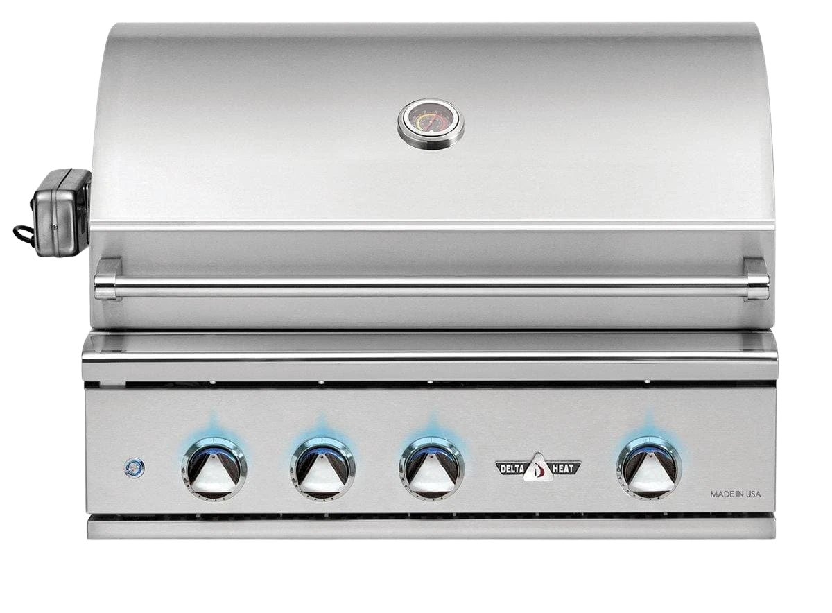 This Delta Heat gas grill brings exceptional quality and performance to any outdoor kitchen. Delta Heat gas grills feature 304 stainless steel with seamless welded construction, sleek high-polished accents, and a double-lined hood for maximum strength, durability, and appeal to your entertaining experience. This 32-inch grill has three (3) 18 gauge stainless steel U-Burners, ceramic briquette flame tamers that distribute the radiant heat more evenly across the cooking surface, and stainless steel cooking grates. Decorative blue LED lights to illuminate the control knobs turning your grill into the main attraction and the interior halogen lights illuminate the 525 square inches of main cooking surface for entertaining at night. The grill has 174 square inches of secondary cooking with an adjustable warming rack. Delta Heat products are designed and manufactured in the USA with pride