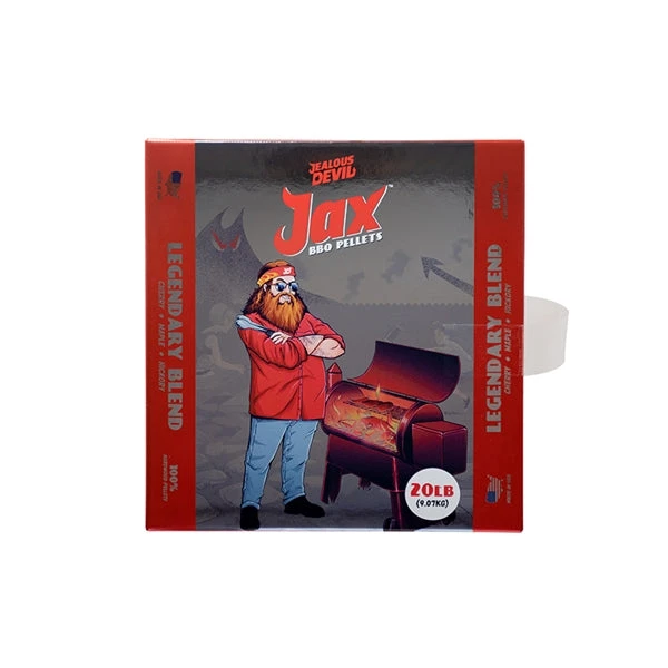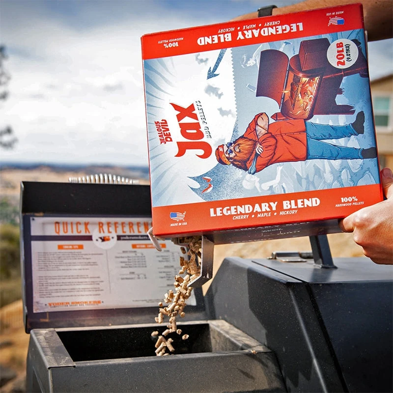 Jealous Devil Jax Hardwood BBQ Pellets never compromise on quality. Proudly crafted in their company-owned facility in the USA. Only select, virgin, bark-free hardwoods are used in our formulations, ensuring flavor, performance, and low-ash content. All of this in a gorgeous weather-resistant box with a built-in resealable pour spout. These pellets are made from a legendary blend of cherry, maple, and hickory hardwoods. Jax BBQ Pellets are 100% natural with no fillers, binders, or additives. The quality and consistency guaranteed – all Jax Pellets exceed PFI (Pellet Fuels Institute)Â standards.