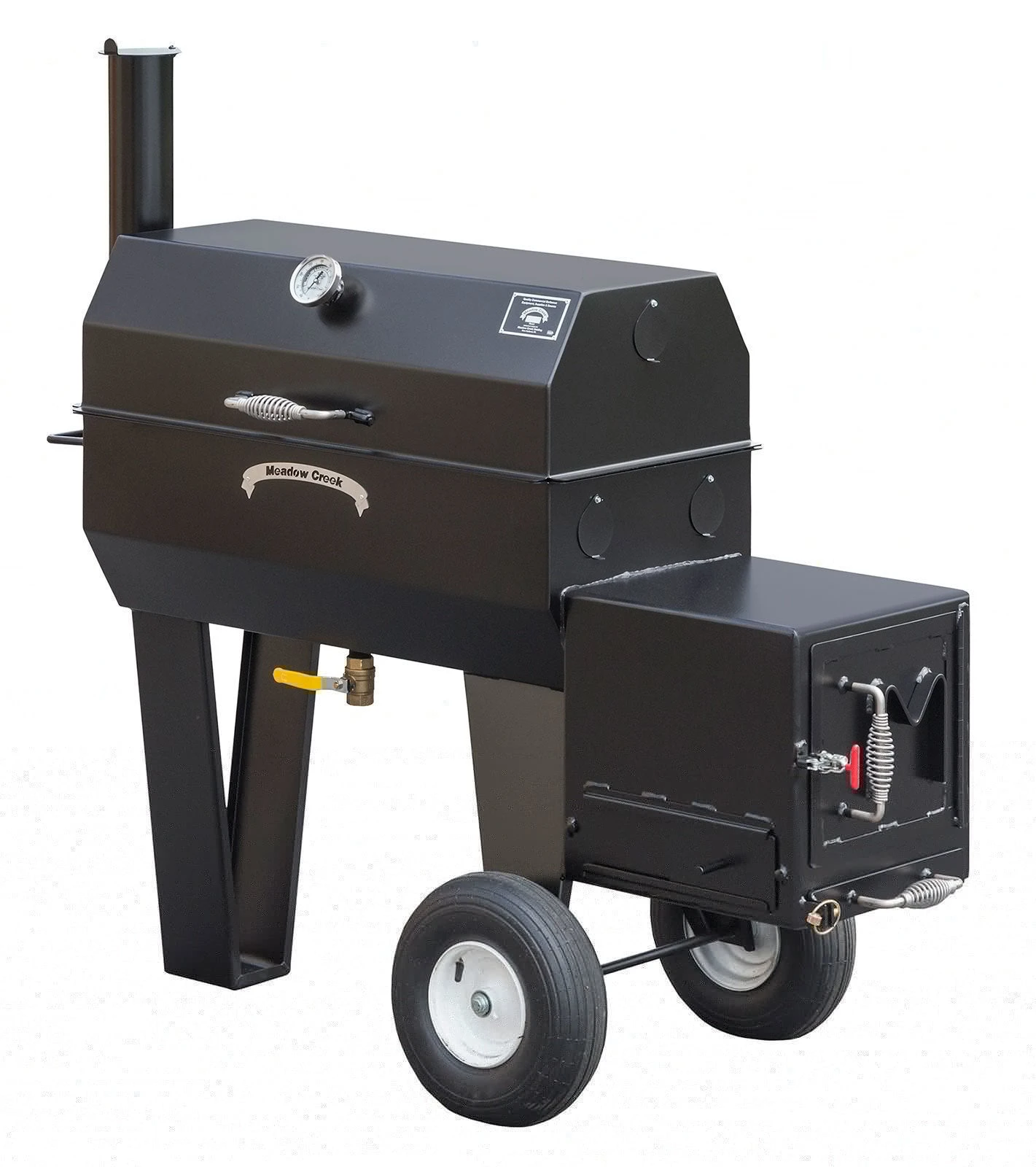 Similar to the PR36 BBQ Smoker, this backyard cooker adds a firebox on the side, for cooking offset smoker style. Indirect heat comes from slowly burning wood or charcoal in the firebox. The removable ash pan and easy access to the firebox make stoking the coals hassle-free.