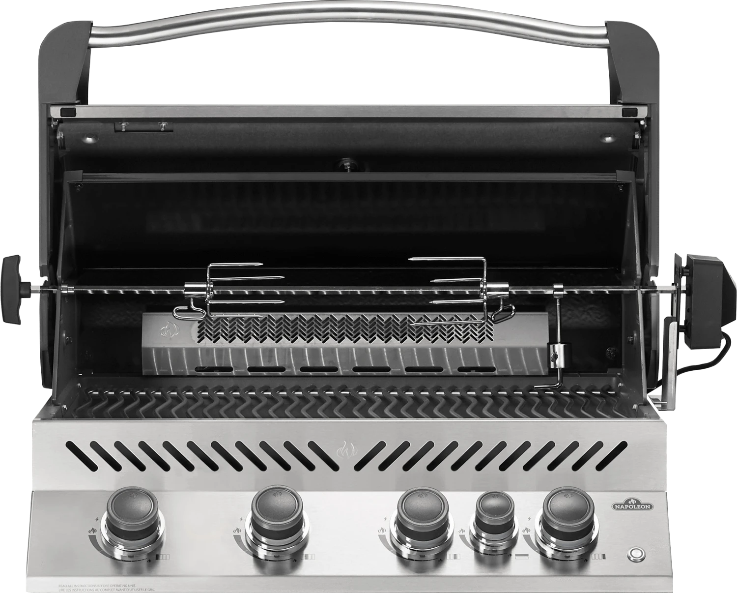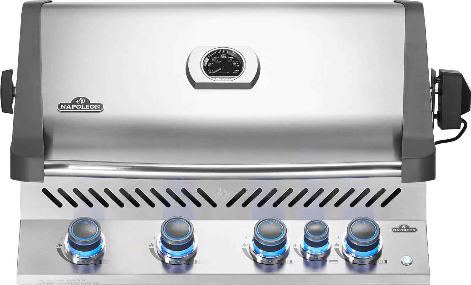 The Napoleon Prestige 500 blends quality and performance into one package. This built-in natural gas grill has four stainless steel tube burners that provide up to 48,000 BTUs of cooking power. The grill has stainless steel cooking grates with 500 square inches of main cooking area and 260 square inches across the plated steel warming area for a total of 760 square inches of cooking area. The Napoleon Jetfire ignition with crossover lighting starts each burner individually for a reliable start-up every time and allows you to light all the burners at the same time. The stainless steel wave cooking grids create the trademark Napoleon sear lines and allow for better heat retention. The dual-level, stainless steel, sear plates vaporize drippings, control flare-ups, and keep your food moist. This Prestige 500 also has an 18,000 BTU stainless steel rear infrared burner and rotisserie kit for roasting. The hood features an Accu-Probe temperature gauge, cast aluminum end caps, and retains heat for oven-like performance. The SafetyGlow control knobs turn from blue to red when a burner is in use. Clean-up is a cinch with the full-width removable drip pan. This Napoleon grill is manufactured in Canada.