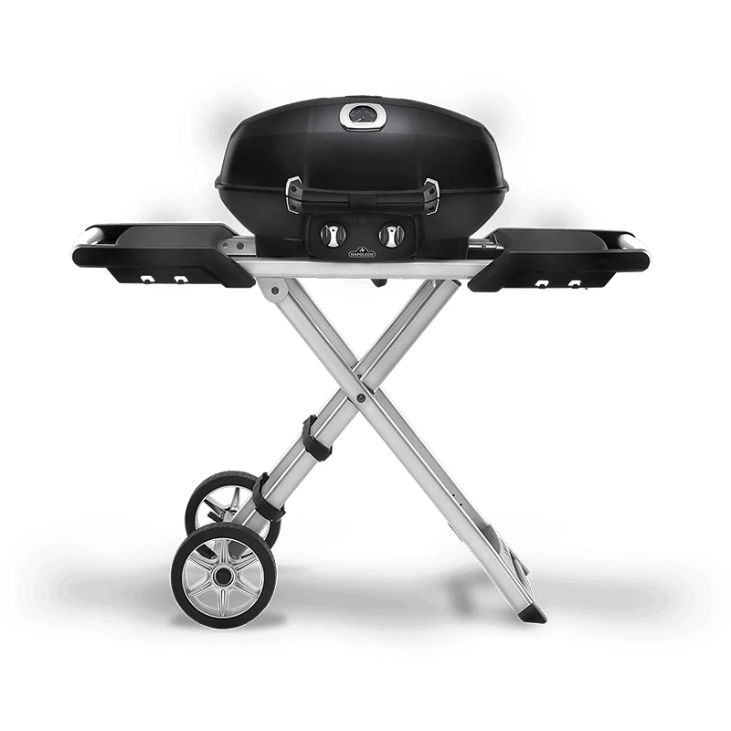 Grilling on the go made easy with portable grills from Napoleon. The Napoleon TravelQ portable propane gas grill provides up to 12,000 BTUs and 285 square inches of cooking area. The removable, porcelainized cast iron wave cooking grids create the trademark Napoleon sear lines. The TravelQ has dual stainless steel burners, allowing you to cook directly over the heat or indirectly for low and slow-style cooking. The Napoleon electronic Jetfire ignition with crossover lighting starts both burners individually for a reliable start-up every time and allows you to light each burner at the same time. The windproof design holds in heat and features a high-top lid for cooking large cuts of meat or poultry. An Accu-Probe temperature gauge is built into the lid for easy temperature monitoring. Easily set up in 10 seconds, the grill uses a standard propane gas cylinder.