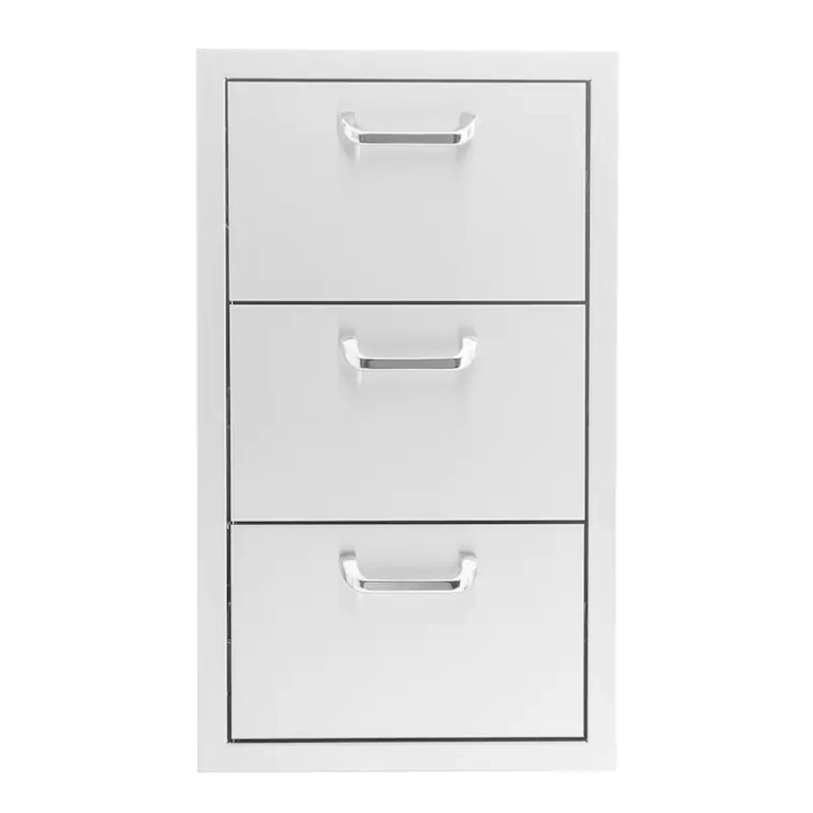 The PCM 260 Series 16-Inch stainless steel triple access drawer is constructed with a 20 gauge, 304-grade stainless steel frame and number 4 brushed finish. This unit is flush mounted for a streamlined appearance. An access drawer is the perfect outdoor kitchen accessory for any outdoor BBQ island, providing storage space for your tools and BBQ accessories. These drawers use heavy-duty, commercial-grade ball bearings on full-length drawer tracks for easy opening and closing. The Traditional handles require installation on the triple access drawer.Â