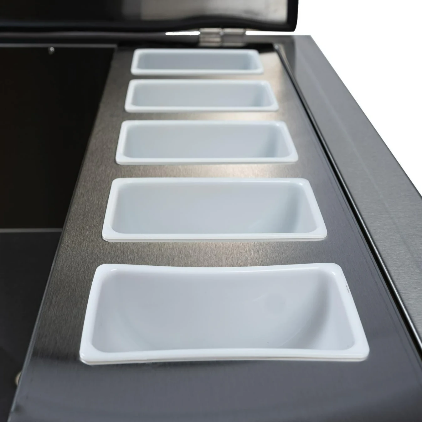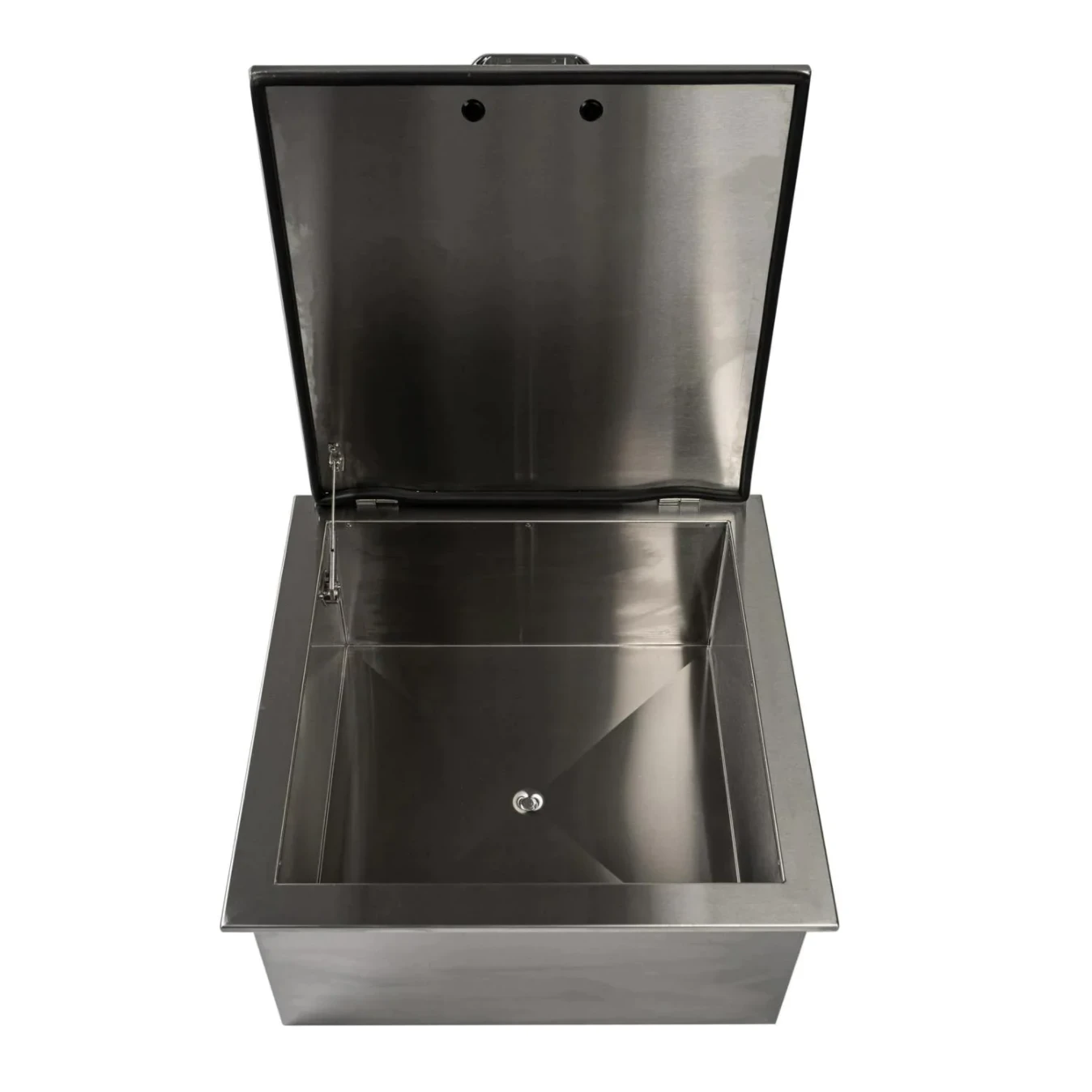 The PCM 260 Series Drop-In Ice Bin Cooler With Condiment Holder is the perfect addition to any outdoor kitchen. The unit features commercial 304 grade, 20 gauge stainless steel construction (including hinges, handles, and frame); removable condiment holder; external flag hinges for easy removal; threaded drain hole in the center of the bin; fully welded and blended corners; and a number 4 brushed finish.