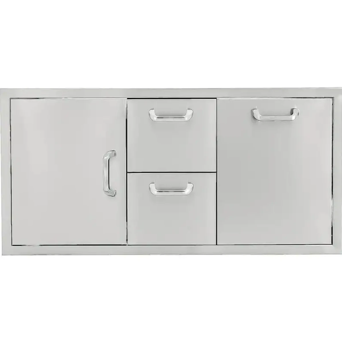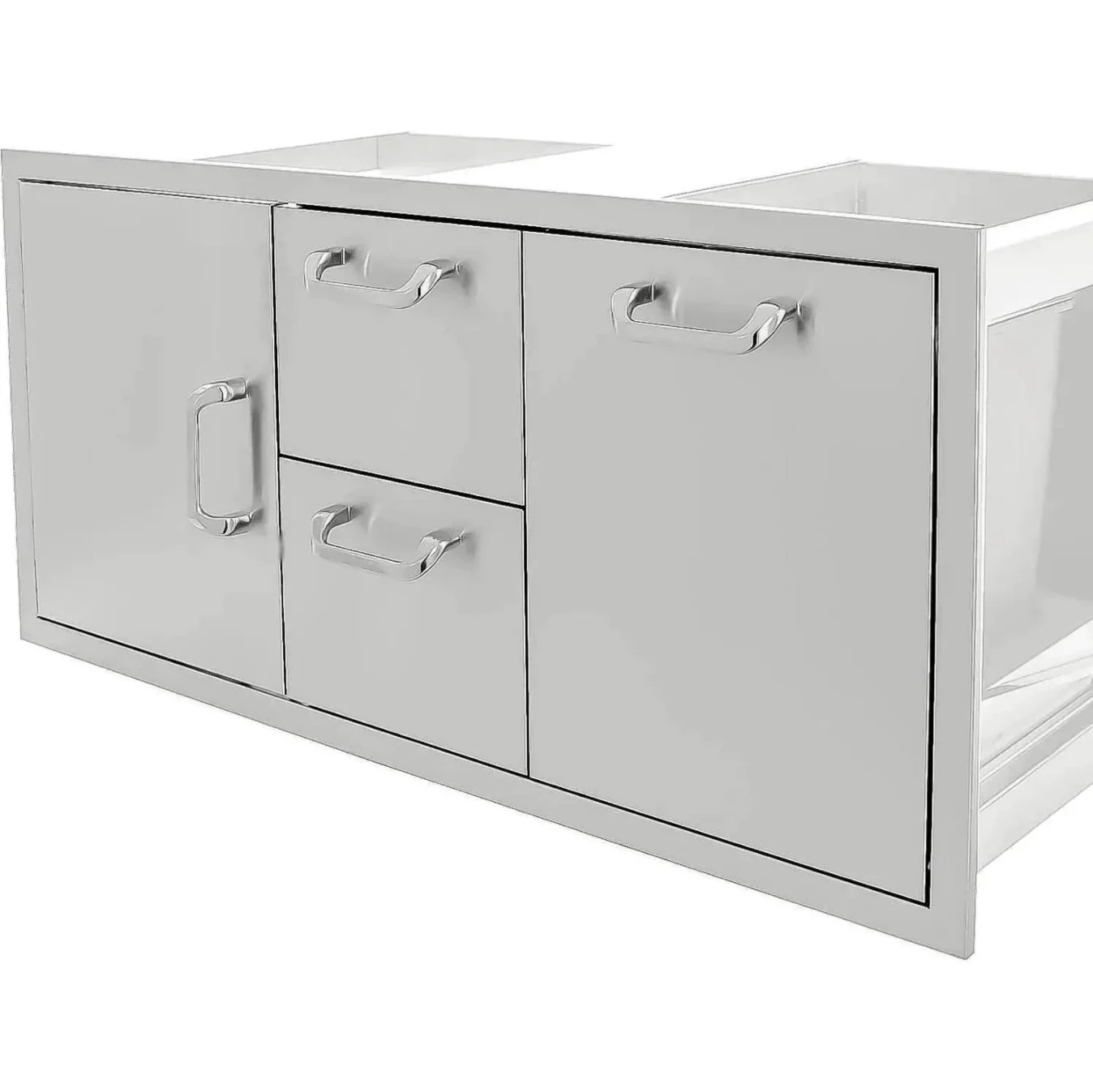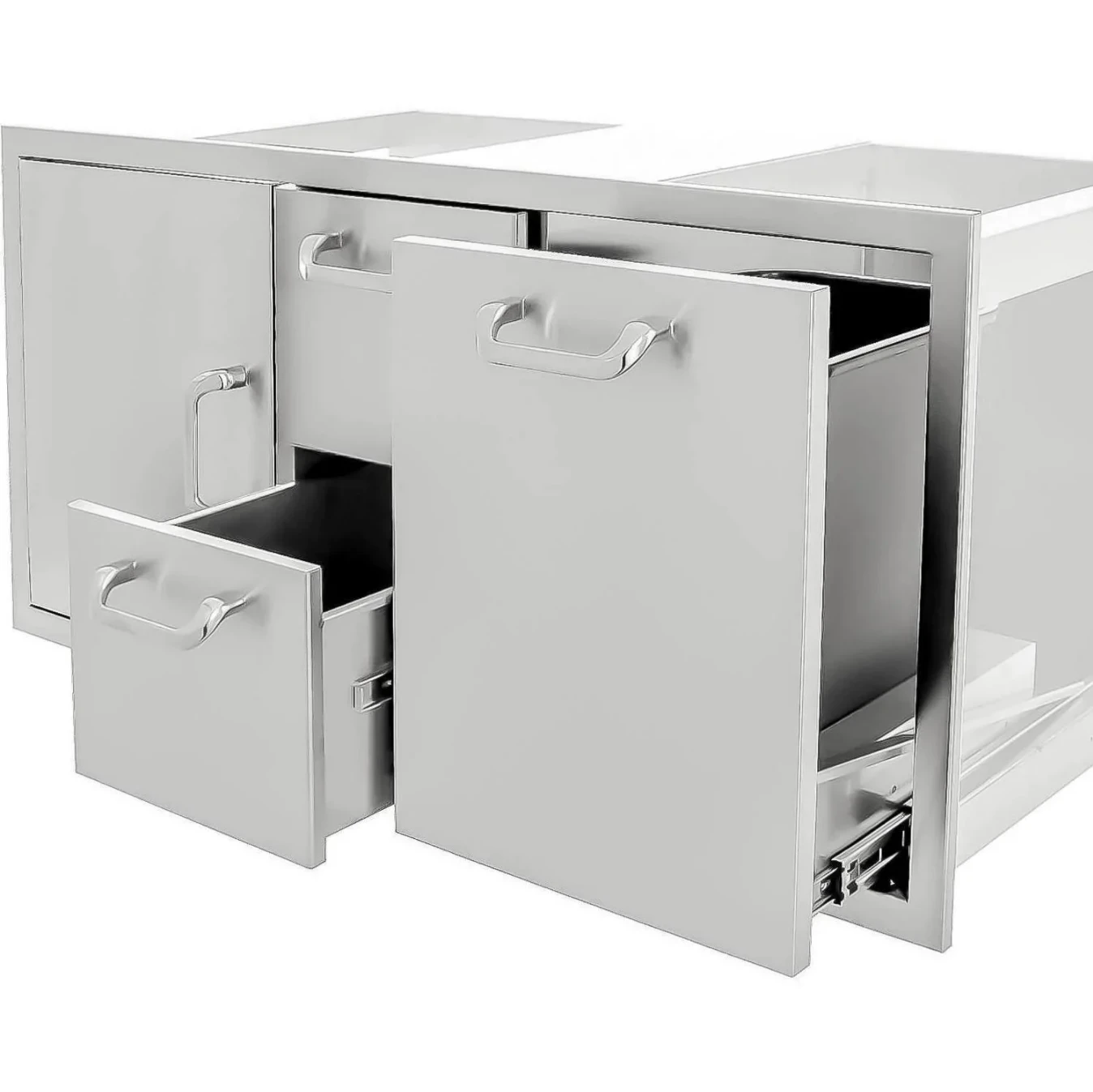 The PCM 260 Series 42-Inch stainless steel door, double drawer & roll-out trash bin combo is constructed with a 20 gauge 304 stainless steel frame and number 4 brushed finish. The unit is flush mounted for a streamlined appearance and a 48-quart trash can is also included. Drawers and roll-out trash bins glide easily on heavy-duty tracks. An access door, drawer, and trash bin combo is the perfect outdoor kitchen accessory for any outdoor BBQ island, providing storage space and access to the underside of grills and side burners. The Traditional handles require installation on the access door, drawer, and trash bin.