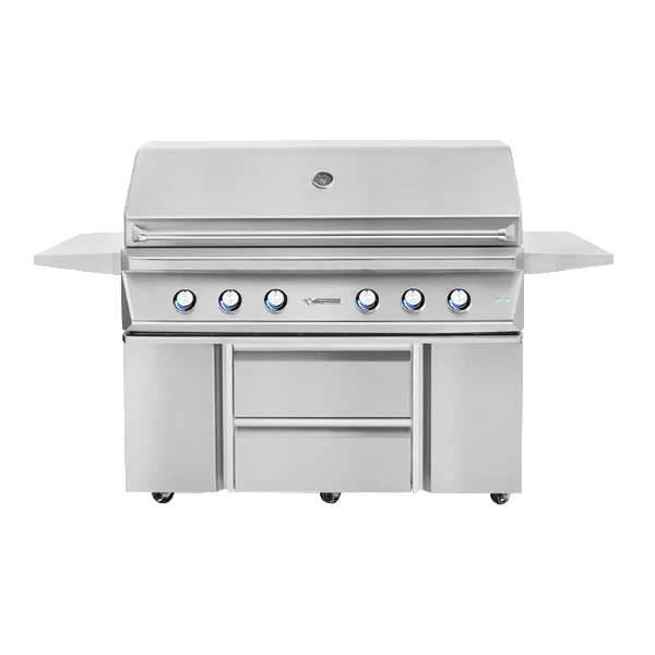 . Standard features include soft-closing doors and self-latching drawers, fold-down side shelves with tool holders, and heavy-duty casters with front brakes for easy maneuverability and locking. The convenient pull-out tray inside holds a trash receptacle or LP tank. Access doors and storage drawers feature flush handle design with high-polished accents.