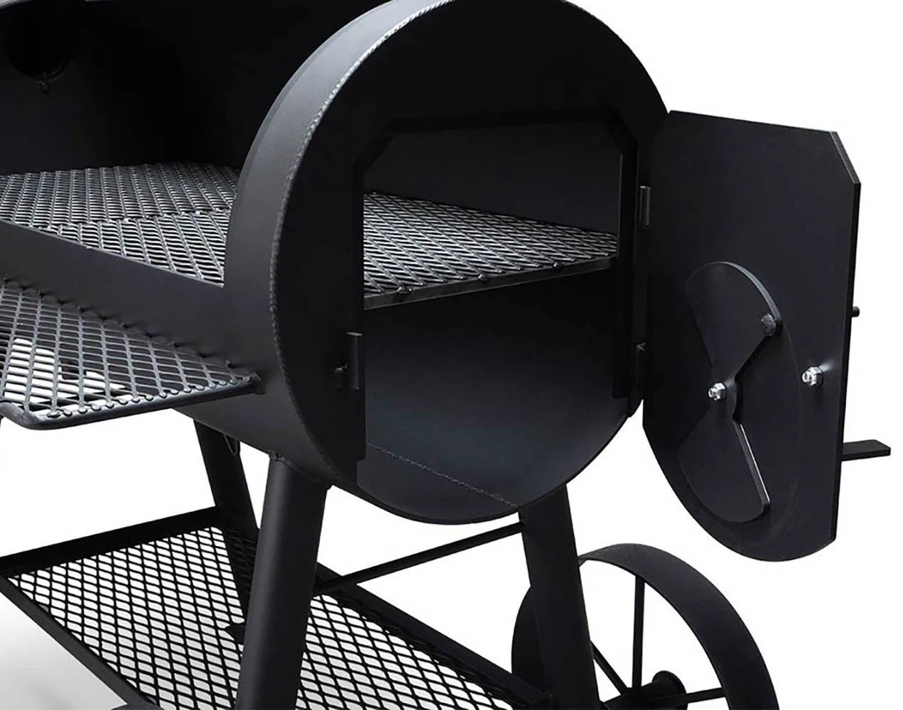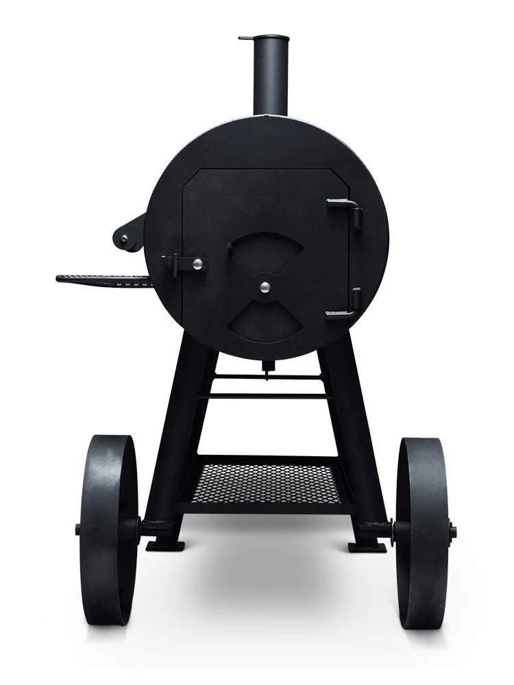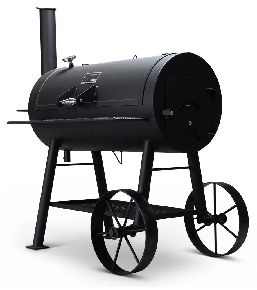 STANDARD FEATURES: 20″ diameter cooking chamber; constructed from NEW 1/4″ pipe and plate; dual-damper through draft control; thermometer mounted on cooking chamber door; stainless steel handles are cool to the touch removable charcoal grate; removable cooking grates; mounted on steel wheels.