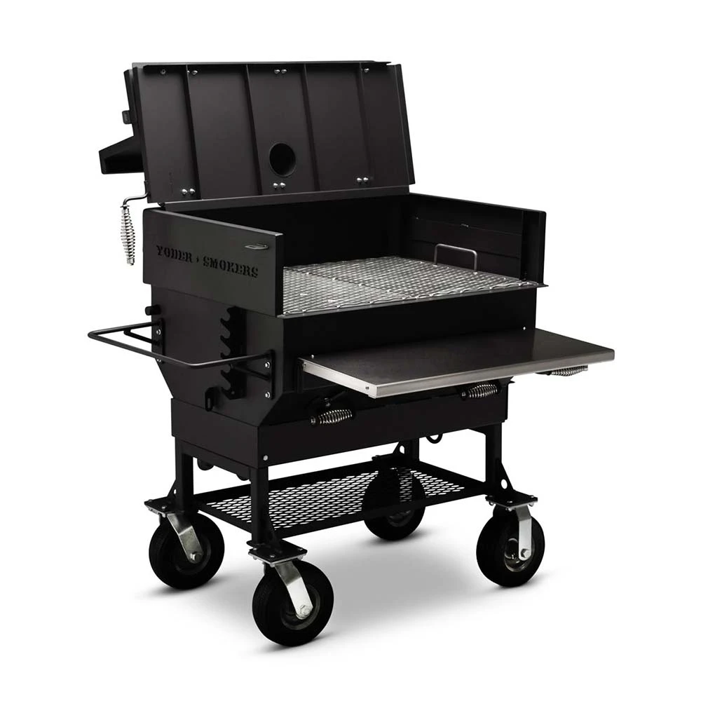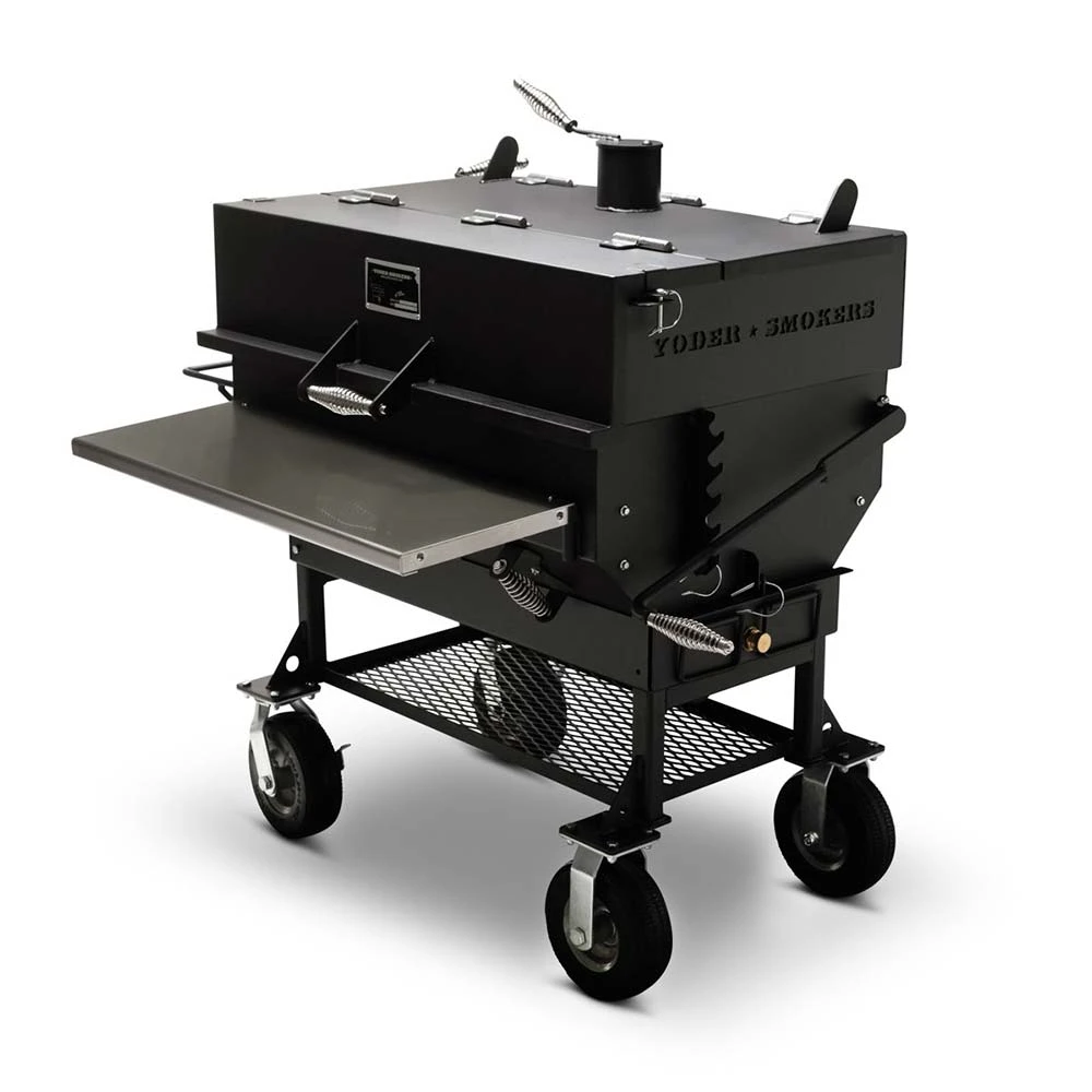 The popularity of cooking over charcoal has steadily increased over the past 10 years, and to meet that demand Yoder Smokers has introduced large format charcoal grills that cater to the folks cooking for a crowd as well as those in the backyard. This 24×36″ grill boasts 864 square inches of cooking surface and heavy-duty American made construction. Key features cooks will immediately appreciate include the variable height charcoal basket, ability to cook indirectly, and the custom stainless steel front shelf. And mounted on casters with 8″ pneumatic tires, this grill makes short work out of positioning on the patio or venue.